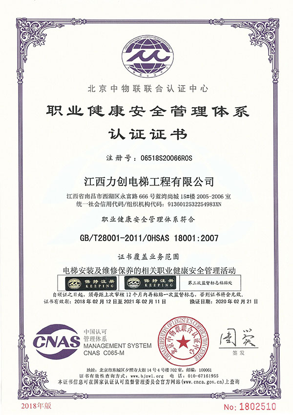 职业管理体系认证证书